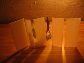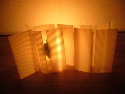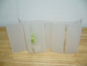 一般的に空間は直方体である事が多いが、この形は使い勝手がいい反面、面白味に欠ける形状だと言える。 間仕切りパネルが多角であれば、仕切られた空間はどちらも多角になり、面白味が出る。 又、透明と半透明材を交互に持ってくる事で影で室内に模様を作れる。 材料:アクリル押出成形ハニカム材(半透明) アクリル板(透明) ジョイント金具