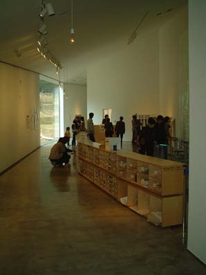 でさっきの場所を振り返って見る。別にどうって事ないけど、白のスクリーンが建物のアクセントになっています。しかし、「足元の水」の作品の(写真真中)鉄板の周りの壁がちょっともったいない様な気がします。プラン的には窓を付けて建物から建物を見る事も十分出来たのですが・・手塚さんは周りの風景を取り込む事を重視したとは言っていましたが・・・個人的には視覚的に繋げてほしかったです。無いほうが写真的にはカッコイイけどね・・ |