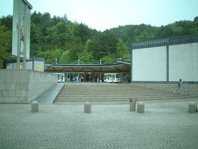 設計テーマは桃源郷らしいがここはまさに桃源郷だった。 琵琶湖から山の中を40分ぐらいひたすら車で飛ばす。途中道は急に細くなったりして、車がすれ違えない場所も多々ある。途中でバスとはちあわせて来た道をバックさせられた。そんな、大変な思いをして、たどり着いた訳だが、雑誌で見たような橋を渡ってない・・あれっと思ってとにかく、見えてる建物に行ってみた。 |