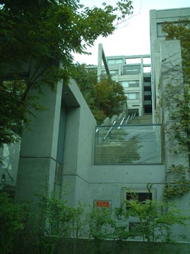 細い道路をえっちらおっちら登りやってきました、六甲の集合住宅!思っていた感じよりやや小規模な建築でこじんまりしている印象を受けた。 又、この敷地は60度の斜面であり、法規制(道路斜線か?)もあってこの形態になっているそうである。 |
