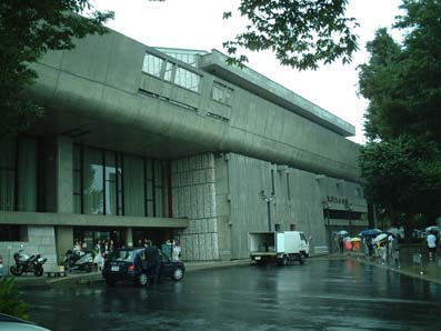 普通に公園口から来るとまずこのアングルで建物が見えます。コーナー部に実に明快にエントランスホールが設けられていますが、やや単純すきる気がします。 |